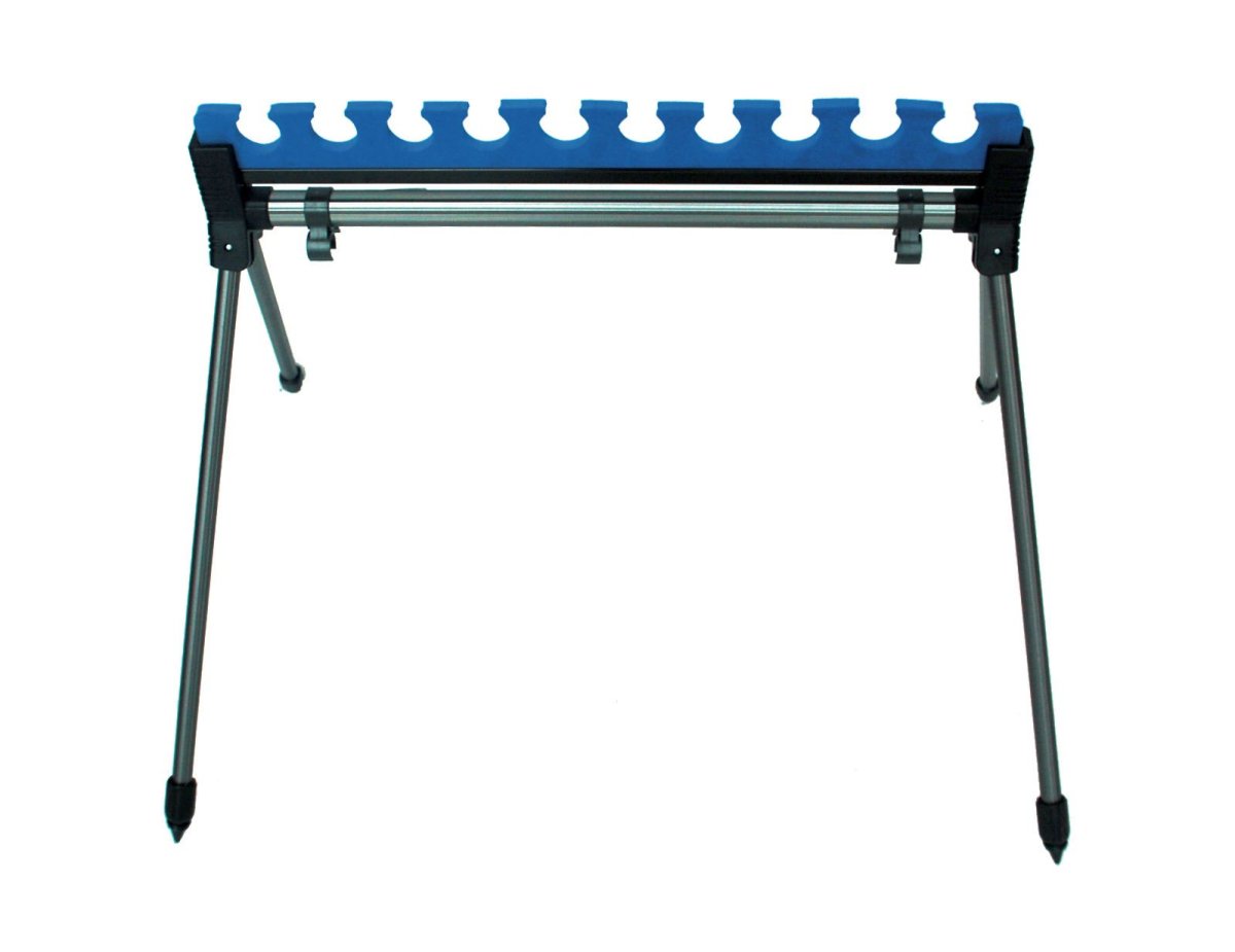 Apoya cañas ideal para la pesca boloñesa para tener varias cañas montadas listas para su uso. Modelo delantero.