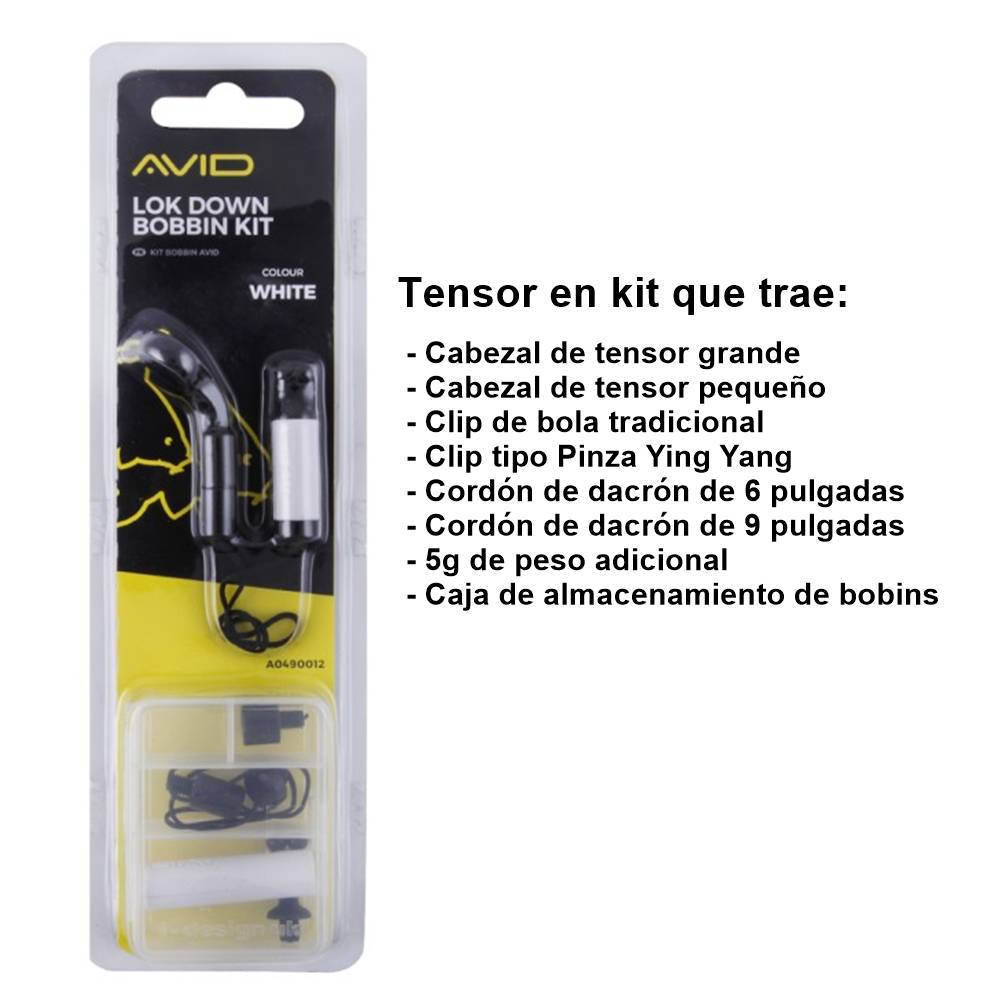 El kit contiene dos clips de línea. Uno es un clip de bola tradicional que permite el movimiento a través de la pinza, mientras que el otro es un diseño Ying-Yang que se puede utilizar libre o pinzado a la línea para una sensibilidad inigualable. Disponible en blanco, azul, verde, morado, naranja y rojo. Los pesos adicionales están diseñados para añadir peso adicional a los bobins Avid cuando las circunstancias lo requieran. Hay un cabezal de bobina pequeño que es ideal para la pesca de corto y medio alcance, así como un cabezal más grande que es adecuado para la pesca de largo alcance. También se incluyen dos cuerdas de Dacron sin memoria, así como un peso adicional de 5 g.