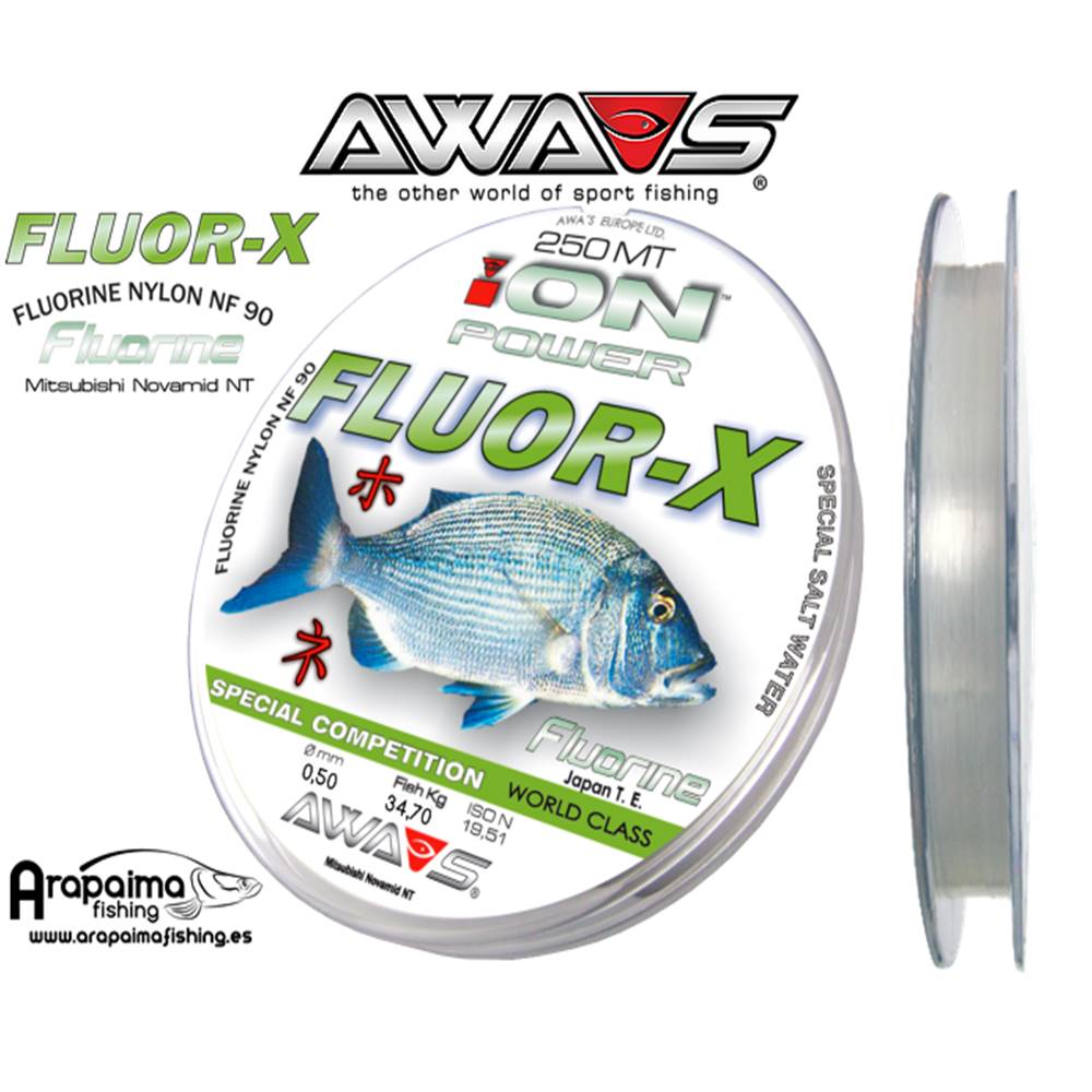 Arapaima Fishing os presenta las líneas pensadas para puente de choque de AWA-SHIMA fabricadas por MITSUBISHI, siendo las únicas lineas del mercado testadas en resistencia a la abrasion y cerficadas por las normas ISO 2062:2010 que certifican la tension de 34,70 kg de las líneas mediante maquinas especializadas. La línea ION POWER FLUOR-X es una fibra japonesa con una alta resistencia a la abrasión y ausencia total de la memoria. Tiene alta resistencia y la fuerza del nudo. Posee un revestimiento de silicona torzal doble realizado de polímeros visokoelasichni. Está diseñado para surf casting y pesca de fondo. La fibra es tsvat transparente Tiene una alta resistencia de nudo de 34,70 kg (CERTIFICADA por NORMA ISO 2062:2010), especial para la pesca de grandes carpas como linea de puente o tramo final para que absorva todos los roces y golpes en lugares dificiles y con obstáculos, de alta resistencia al nudo inmutable, resistencia a la abrasión perfecta, memoria cero. Hecho de MITSUBISHI Novamid NT , polímero embobinado en paralelo, desarrollado y probado por Craig Neil. Disponible en bobinas de 250 metros.