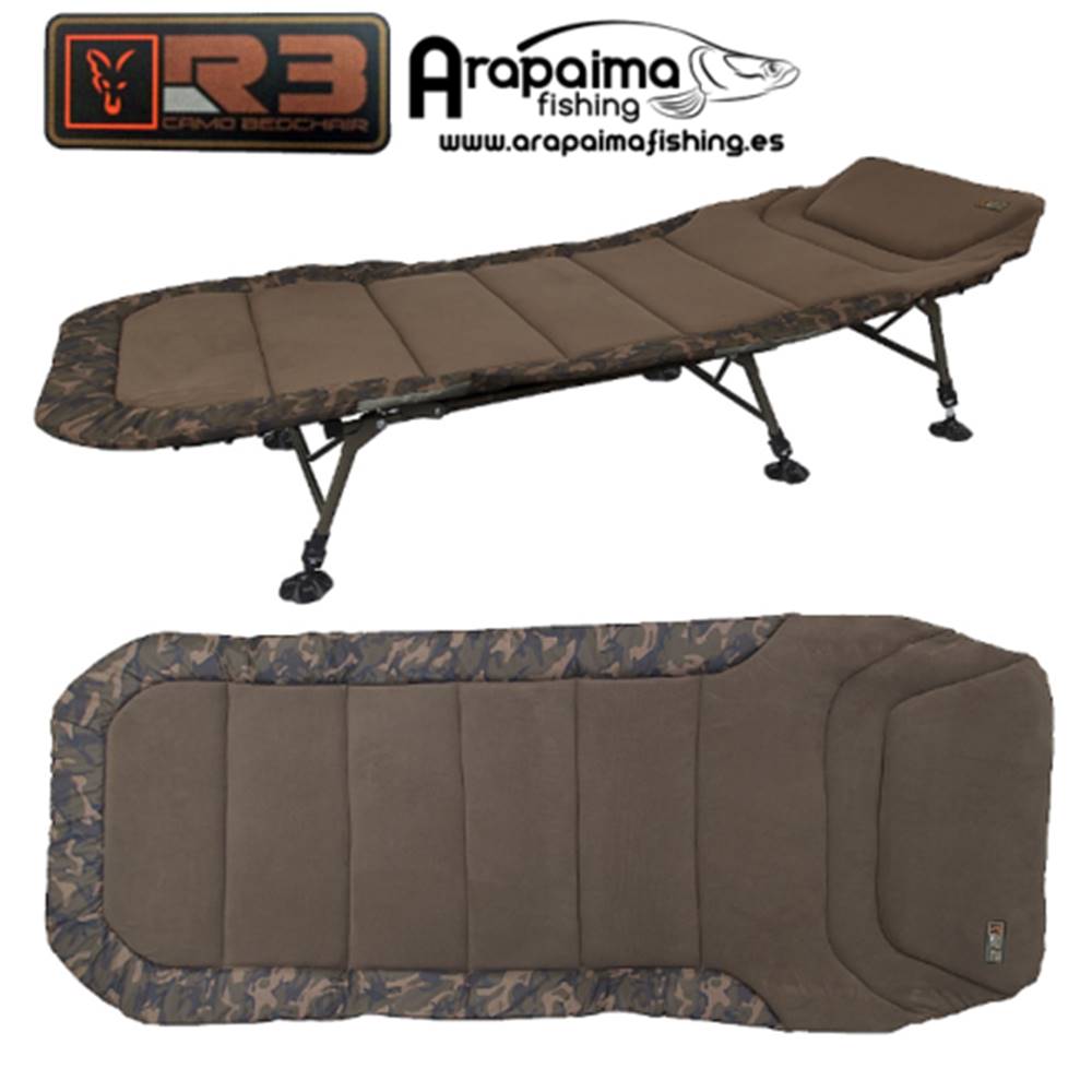 Bed Chair Fox R3 Camo Arapaima Fishing tiene el gusto de presentarles la nueva FOX R3 de camuflaje CAMOLITE de 6 pies. La nueva R2 Camo es una cama «King Size» de tamaño de 223 cm de largo por 101 cm de ancho que ha sido diseñada con el camuflaje de la nueva gama CAMOLITE. Cuenta con un diseño plegable en plano sin la molesta rueda que le permite utilizar todo el ancho de la cama. Tiene un marco de aluminio con pintura epoxi verde camuflaje que se combina con un confortable colchon de tejido acolchado micropolar para asegurar una agradable noche de sueño. Cada pata es extensible y cuenta con pies giratorios para asegurarse de que puede establecer la buena cama y nivel cuando en un terreno irregular. Una doble correa y hebilla permiten la cama para plegar muy compacto para su fácil transporte. Presenta un soporte tensor de la zona lumbar que le permitirá mantener la cama tensa en todo momento para un descanso ideal en nuestras sesiones de pesca. Características técnicas: Doble perfil plano para el máximo confort Diseño-Cam libre para máxima anchura útil soporte lumbar completa para asegurar colchón firme sin flacidez Flece forrado, colchón acolchado características patrón Fox Camolite de ajuste acolchado extra en cabecera bisagras dobles permiten un saco de dormir para ser doblado en el interior correas laterales únicos para garantizar la cama es compacto cuando empacado Ampliación giratorias barro pies 6 patas ajustables