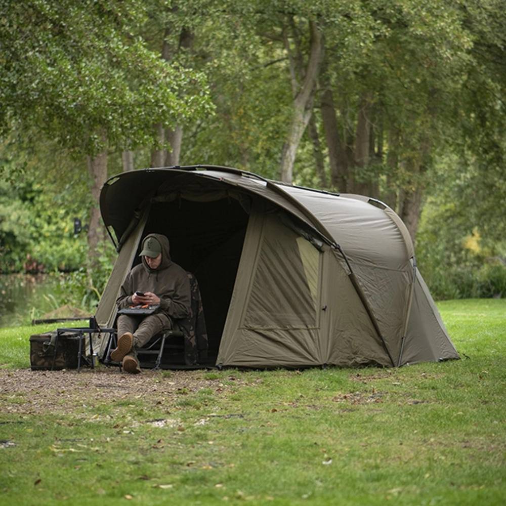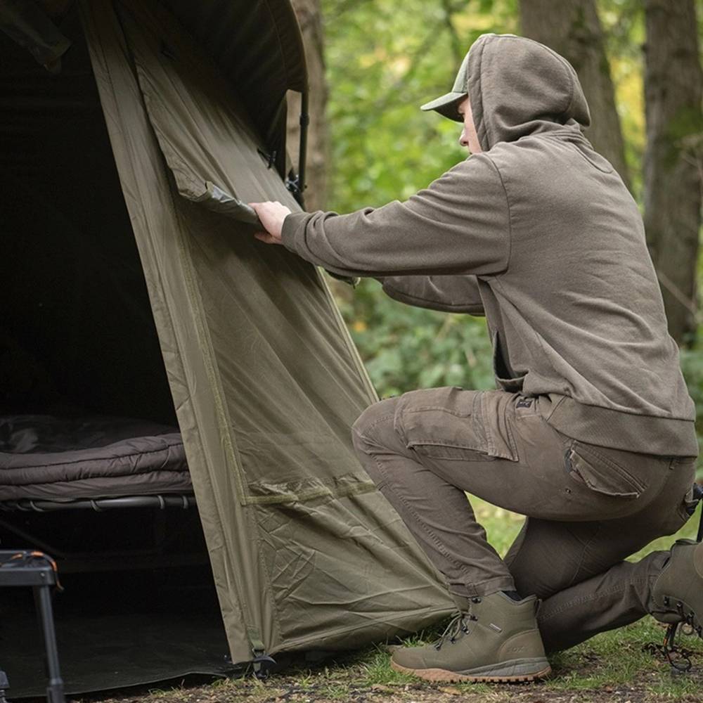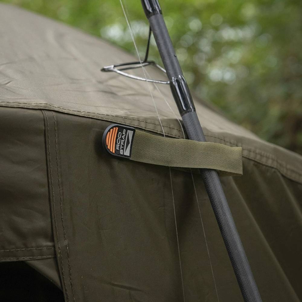 Tejido caqui con estructura verde, además de dos correas para cañas en la parte delantera del refugio.