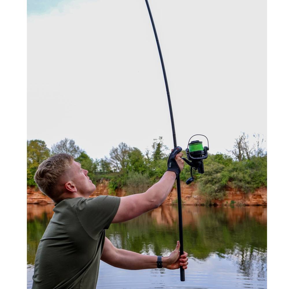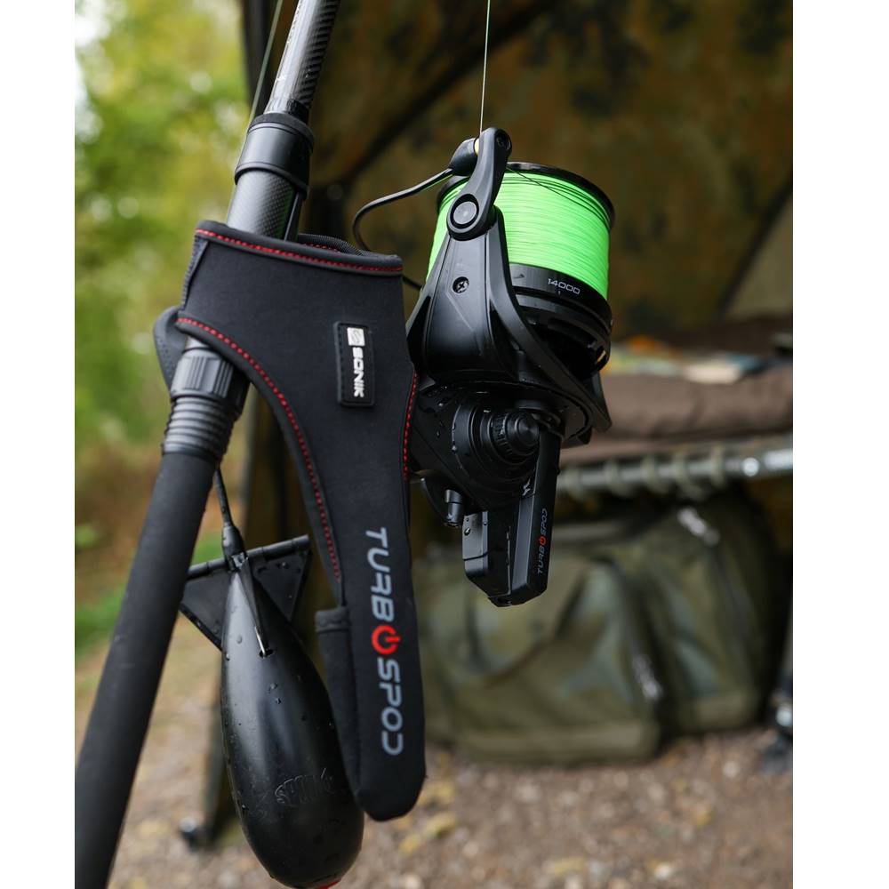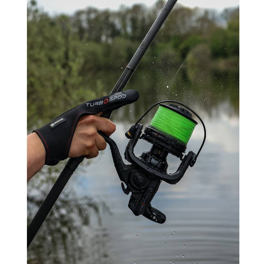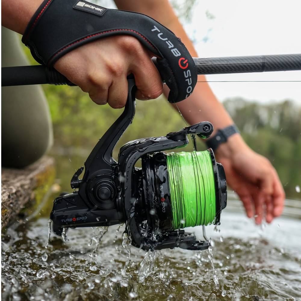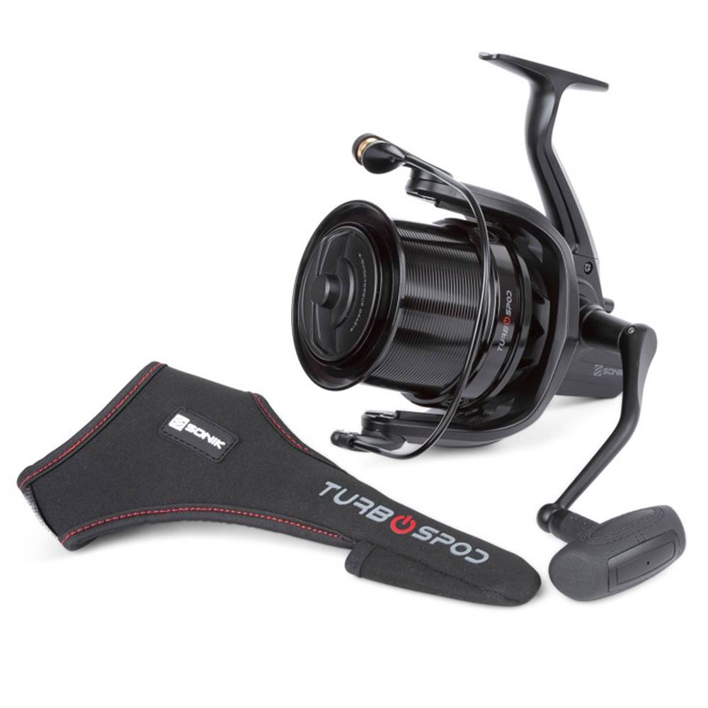 El nuevo Carrete Sonik Turbospod 14000, ha sido diseñado para el cebado con cohete o spodding a gran velocidad. Con su relación de transmisión ultrarrápida de 5,7, este carrete alcanza una impresionante recuperación de 1,45 m por vuelta de manivela. Diseñado para un carrete de alta resistencia, el sistema de engranajes de eje sinfín, el protector de línea flotante del rotor y el guíahilos antitorsión de gran tamaño facilitan el cebado con spodding a gran distancia. El Turbospod 14000 es excepcionalmente robusto y cuenta con un eje principal de acero inoxidable y un cuerpo y rotor de grafito de alta resistencia, lo que lo mantiene ligero (680 g para su tamaño). Otras características incluyen bloqueo de rotor con asa abierta, oscilación ultralenta para una colocación perfecta del hilo y tres clips de línea cautivos en la bobina para un marcado triple. Para una pesca con spodding a gran velocidad, la manivela de aluminio CNC anodizado en negro cuenta con una cómoda empuñadura de goma moldeada. Cada carrete Turbospod incluye un dedil de la marca Sonik para proteger el dedo al lanzar con trenzado.