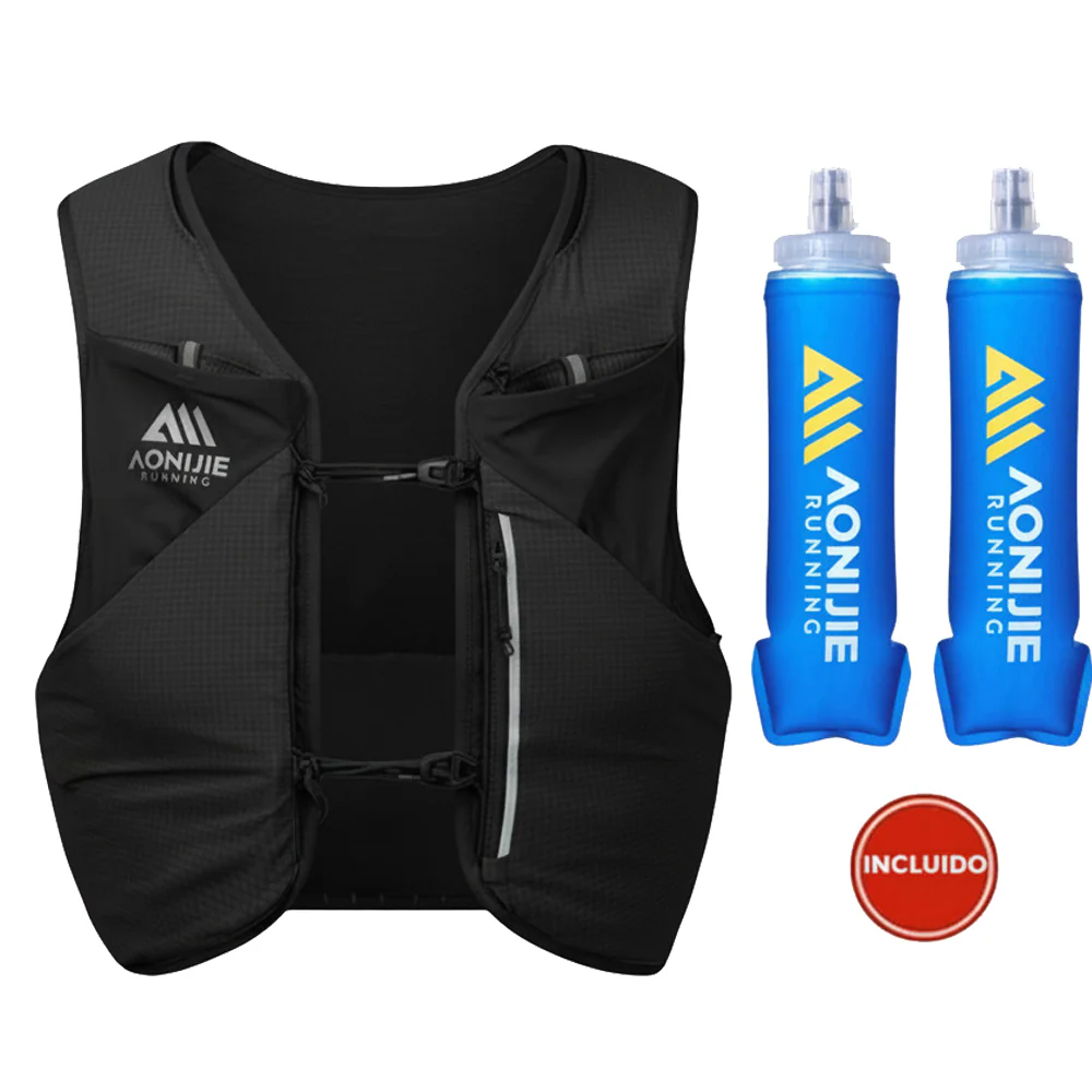 - Accesorios incluidos: 2 soft flask 500ml (boca ancha) + manta térmica + silbato emergencia + mini saco reutilizable