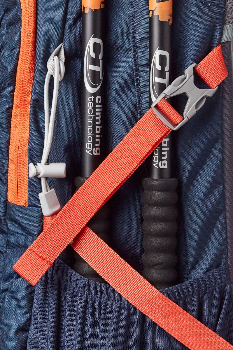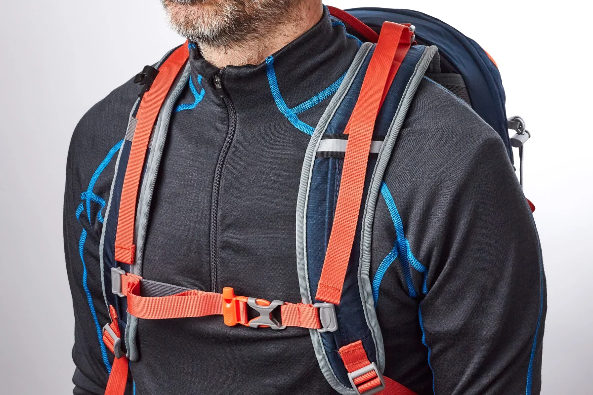 Funda para la lluvia, tensor de pecho, silbato de emergencia, cintas compresión lateral, bolsillo rejillas laterales, riñonera con bolsillos, soporte para bastones, acceso hydrobag, modelo unisex.