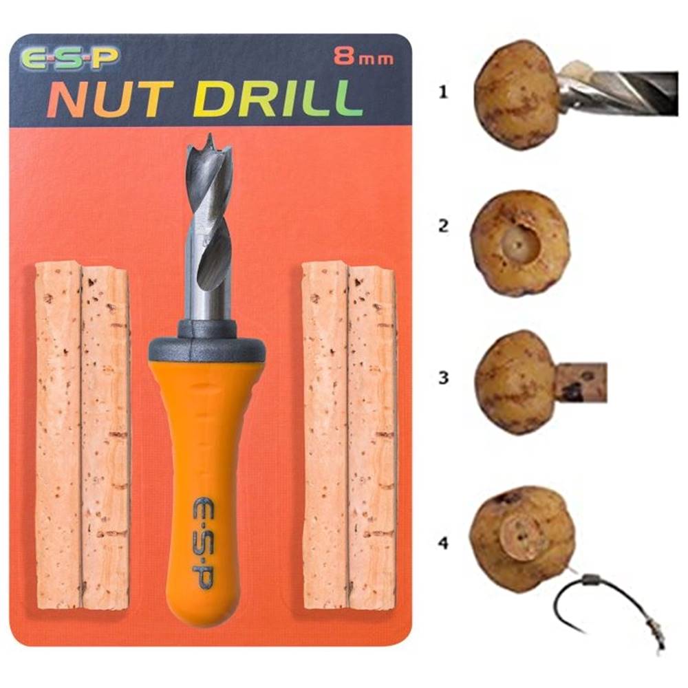 Perfecta broca con punta triple para peforar boilies y CHUFAS XXL para equilibrar tus montajes con corcho (viene incluido) o foam.Diametro ideal de 8 mm para que no se abran los boilies o chufas al perforarlas.