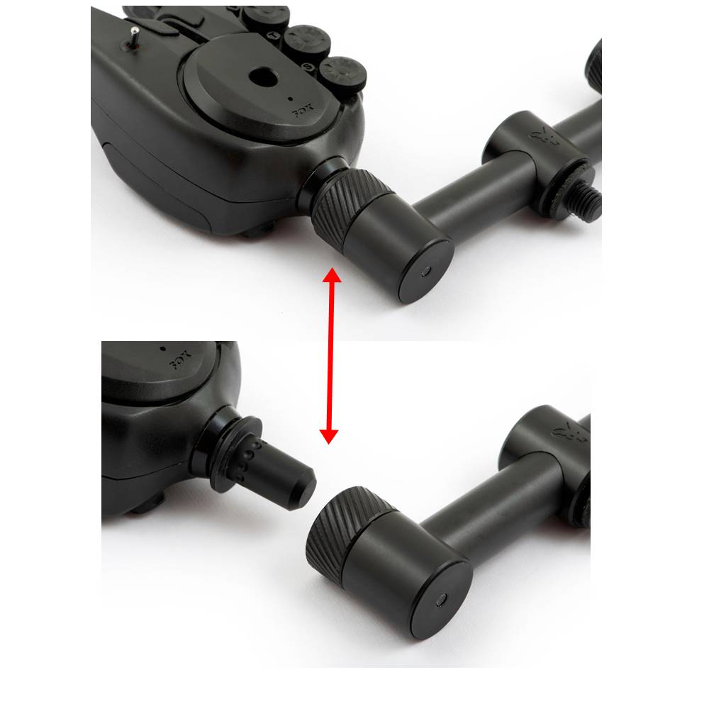 - Las alarmas y los apoya cañas se pueden unir a las barras de BUZZ y soltar con un simple giro del collar estriado.