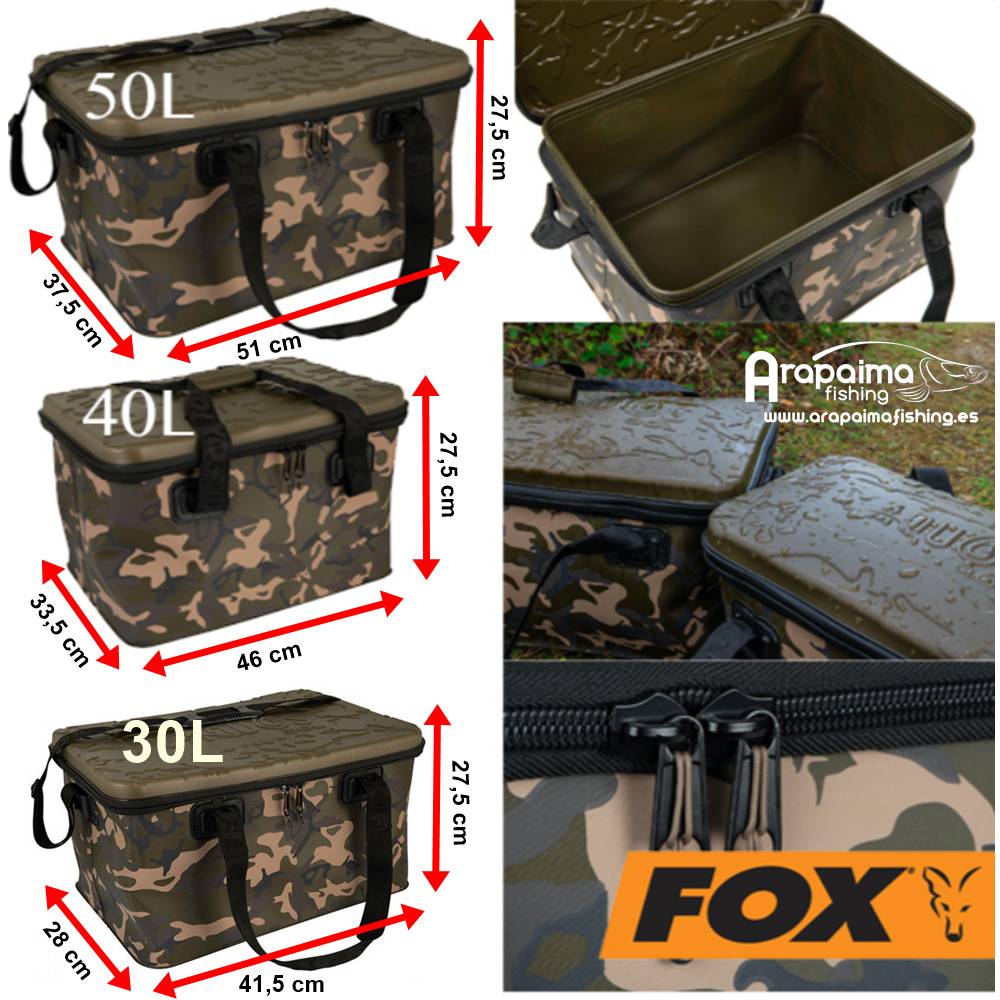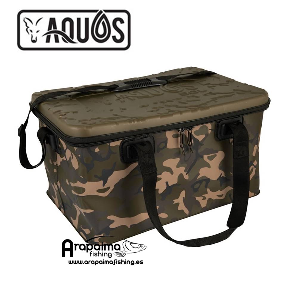 Bolso Impermeable Fox Aquos Camo 40LLa gama de equipajes Aquos Camo ofrece un almacenamiento100% impermeable, lo que le permitirá guardar su equipo con la garantía de queestá protegido de la humedad.Además, con su exclusivo color Camo de Fox, es el complementoperfecto para la gama de almacenamiento de Camolite Fox.Estar tranquilo si el tiempo cambia en la orilladel agua. Tu material estará bien protegido!Un bolso en EVA robusta e impermeable que es ideal paramuchas aplicaciones como almacenar el cebo, llevar la comida, utensilios de cocina o como bolso de ropa.Caracteristicas: Exclusivo acabado en color de camuflaje Fox.Paredes de 1mm con una placa base reforzada de 1,5mm.Cremalleras de 10mm.Tapas moldeadas de color caqui.Correas en poliéster reforzadas.Manijas de cierre ergonómicas.Dimensiones : 46cm x 33,5cm x 27.5cm