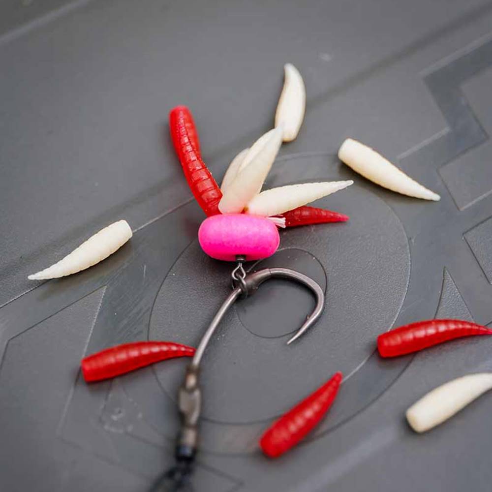 – 10 gusanos de goma blancos y 10 rojos, flotantes, blandos y flexibles, que parecen reales
