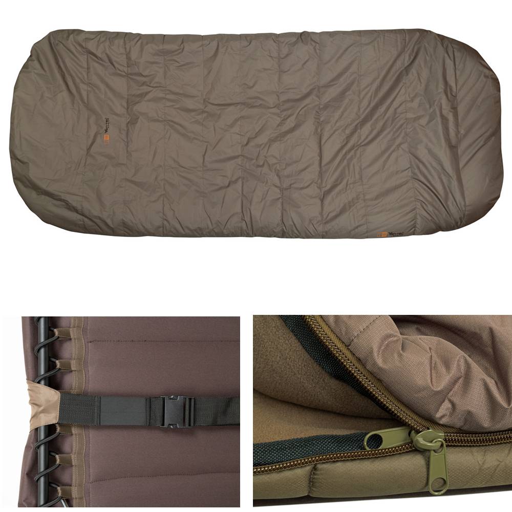 La capa base se beneficia de un relleno de fibra hueca de 7 núcleos, con tratamiento de silicona para ayudar a mantener la forma y expandir las fibras. Las costuras descentradas del panel permiten retener el aire caliente dentro del saco durante más tiempo. El tejido de la capa base exterior de poliéster suave antidesgarro mejora la transpirabilidad en colchones bedchair.