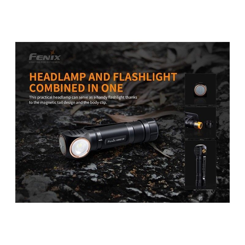 El frontal Fenix HM61R es un frontal recargable multifuncional que también se puede utilizar como linterna. Equipada con dos fuentes de luz blanca y roja, este frontal emite una salida máxima de 1200 lúmenes. Tiene la superficie la cola magnética. Además el frontal HM61R también puede encargarse de la iluminación de cerca. Las características adicionales incluyen carga magnética USB, indicación de nivel de la batería, indicación de carga, interruptor lateral de gran tamaño y cinta vertical, todo lo cual hace que el frontal HM61R sea un frontal inigualable en la versión linterna / frontal.