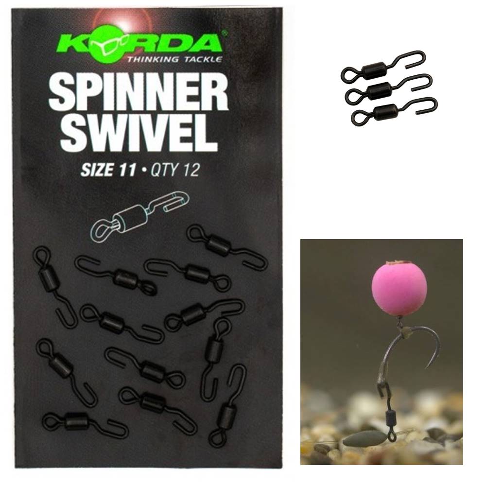 El Spinner Swivel sin anilla de Korda es un emerillón específicamente desarrollado para la realización de los célebres montajes Spinner Rig o Ronnie Rig. Para esos montajes, este emerillón Spinner Swivel de Korda posee una apertura más ancha y alargada que facilitará el paso del anzuelo. Hasta ahora la utilización de un emerillón tipo Kwick Change (enganche rapido) necesitaba un utensilio para forzar la apertura. El Spinner Swivel permitirá de ahora en adelante cambiar libremente del azuelo si este último se encuentra despuntado o roto. Solo os queda el utilizar un tubito termo retráctil o un alineador de línea y ya está listo!