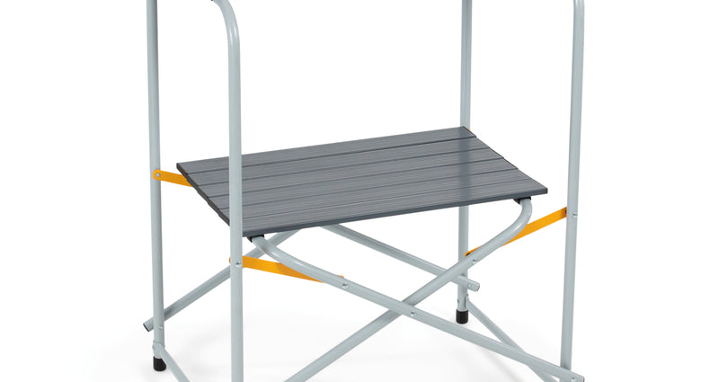 Una mesa de cocina de campamento liviana y portátil con estructura de acero y tablero de listones de aluminio. Cuenta con una mesa de trabajo espaciosa para estufas grandes e incluye un estante de almacenamiento para mayor comodidad. Rápido de montar y desmontar.