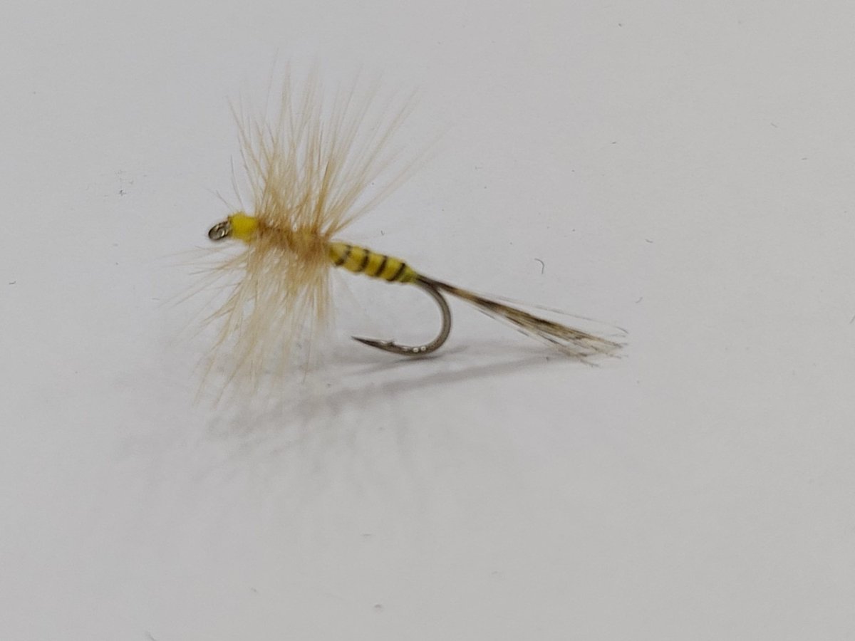 Mosca montada con los mejores materiales; pluma hoffman, cuerpo amarillo con brinca negra y montada en un anzuelo numero 14.