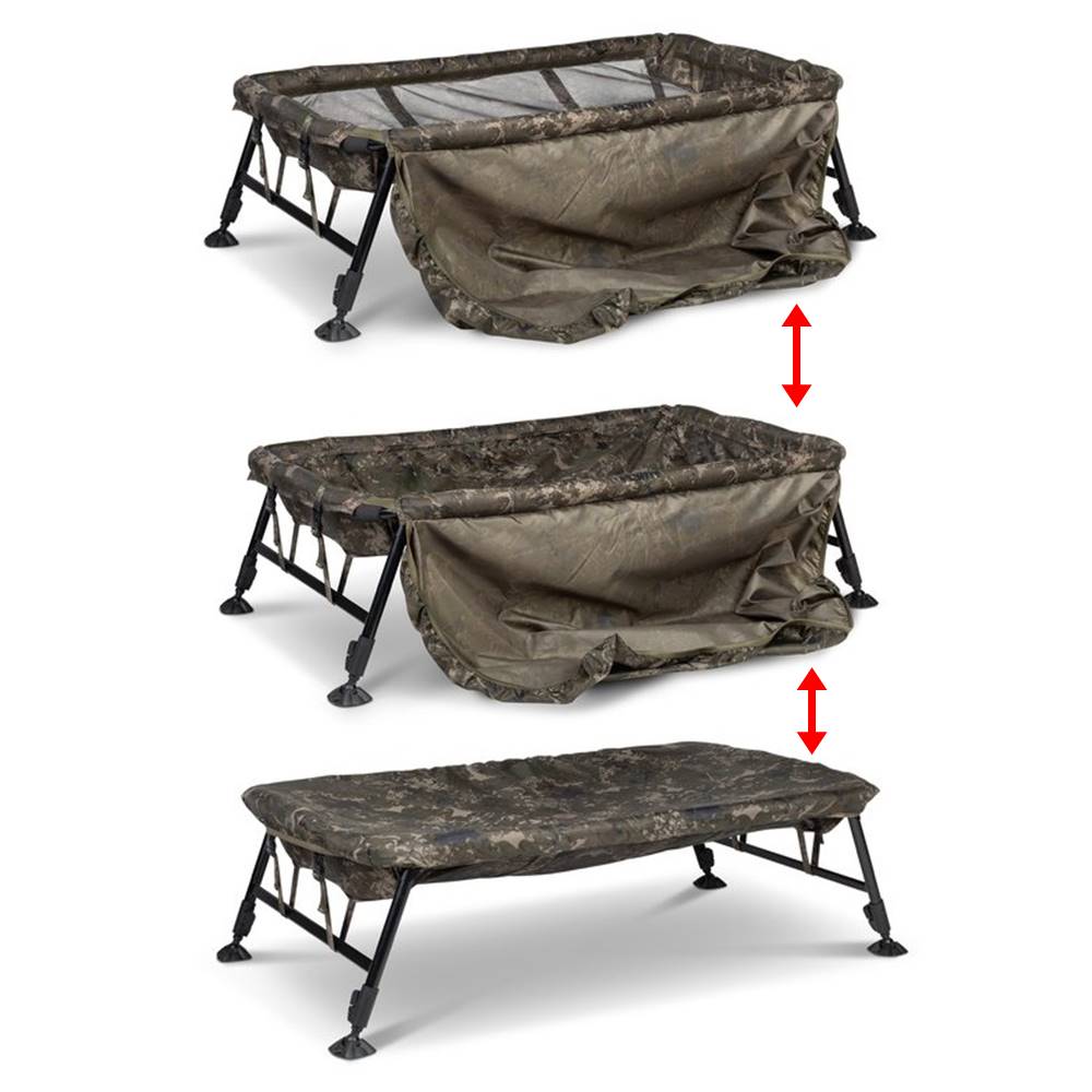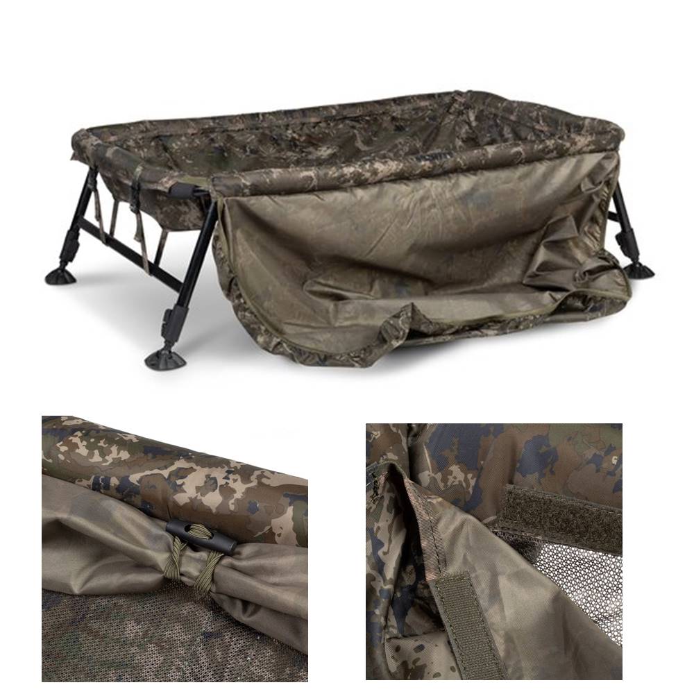 La cuna Monster Camo Hi Protect te permiten elegir instantáneamente si retienen agua o no, ya sea por preferencia personal o para mantenerte dentro de las reglas de la pesca. La base de malla de drenaje libre cuenta con un panel adicional de retención de agua de nailon 210D asegurado con velcro, que se agrega o quita en segundos.