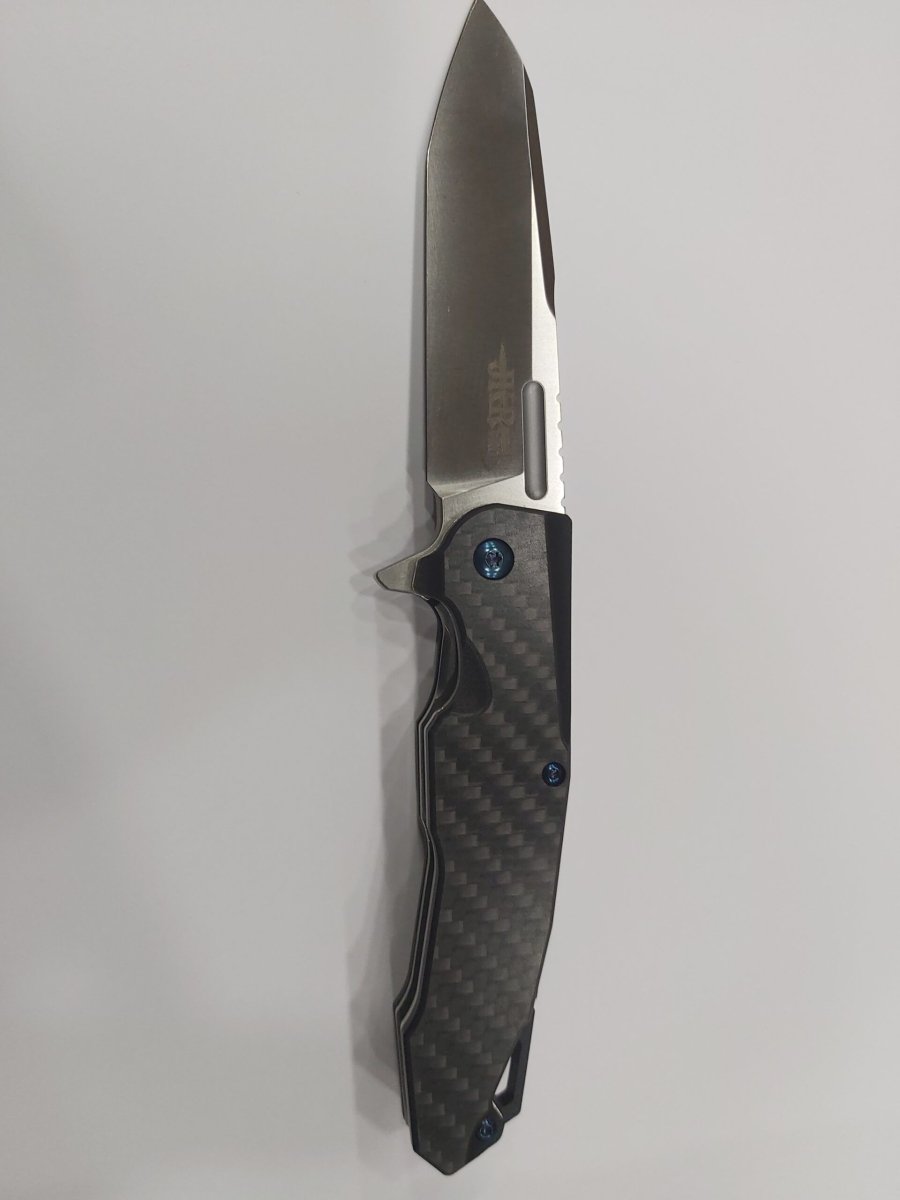 Descripción: Navaja táctica serie PRO fabricada con materiales de la más alta calidad y resistencia. Puño de G10 y fibra de carbono. Hoja de acero D2 con una extrema resistencia al desgaste, durabilidad y retención de filo. Apertura con rodamiento. Bloqueo de seguridad Liner lock. Clip trasero color azul para cinturón. Incluye funda de tela, caja-estuche imantado y gamuza para limpieza.