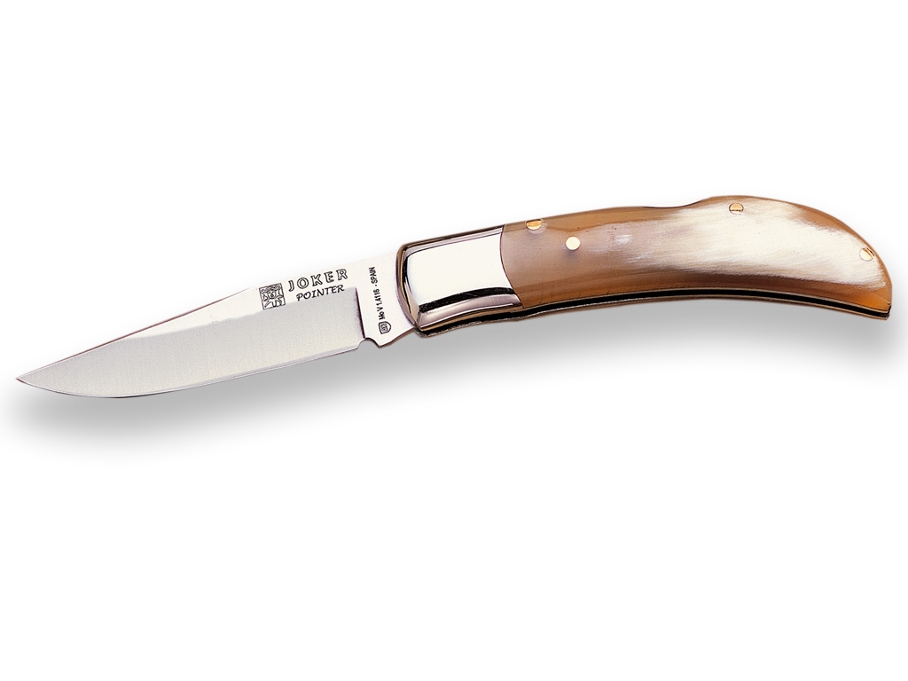 Navaja Joker Pointer fabricada en cachas de asta de toro y con hoja de acero Inoxidable MOVA 1. 4116 con casquillo de acero que le aporta un toque.