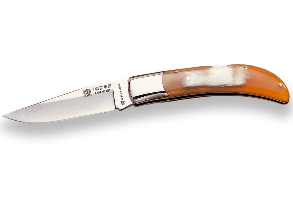 Navaja Joker Pointer fabricada con un mango de asta de toro y una hoja de acero Inoxidable MOVA 1. 4116 y con una virola de acero que le da un toque.