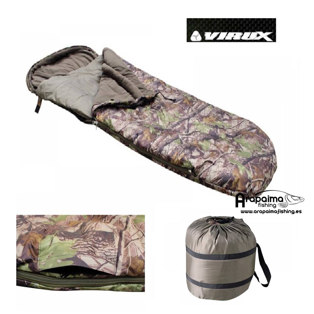 Saco de dormir con estampado de camuflaje y forro de nailon 190T extraíble. Dispone de una capa interior desmontable fabricada en microfibra y revestida en micropolar, ideal para los inviernos mas frios. Se acopla perfectamente a la bed chair gracias a sus solapas en los estremos de la parte superior e inferior ademas de una correa por el medio para abrazar la bed chair. Bolsillo exterior con cierre de velcro. Cordones en la parte superior para ajustar y cerrar el saco de dormir una vez dentro. Cinturón de seguridad. Viene con un bolso de transporte