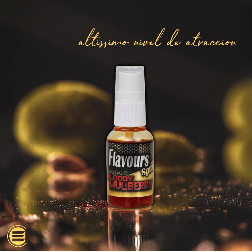 Flavours Spray 30ml Bloody Mulberry concebido para sumergir los cebos artificiales y potenciar tus Pop Up. Gracias a su formula liquida y fluida conseguimos que se adhiera rapidamente sobre tus cebos artificiales para que siempre puedas crear tu cebo de anzuelo perfecto para cualquier circustancia con nuestro olor caracteristico Bloody Mulberry gama Gold. Su composicion es ideal para generar un poder de atraccion muy concentrado sobre la base de tu cebo artificial de anzuelo.