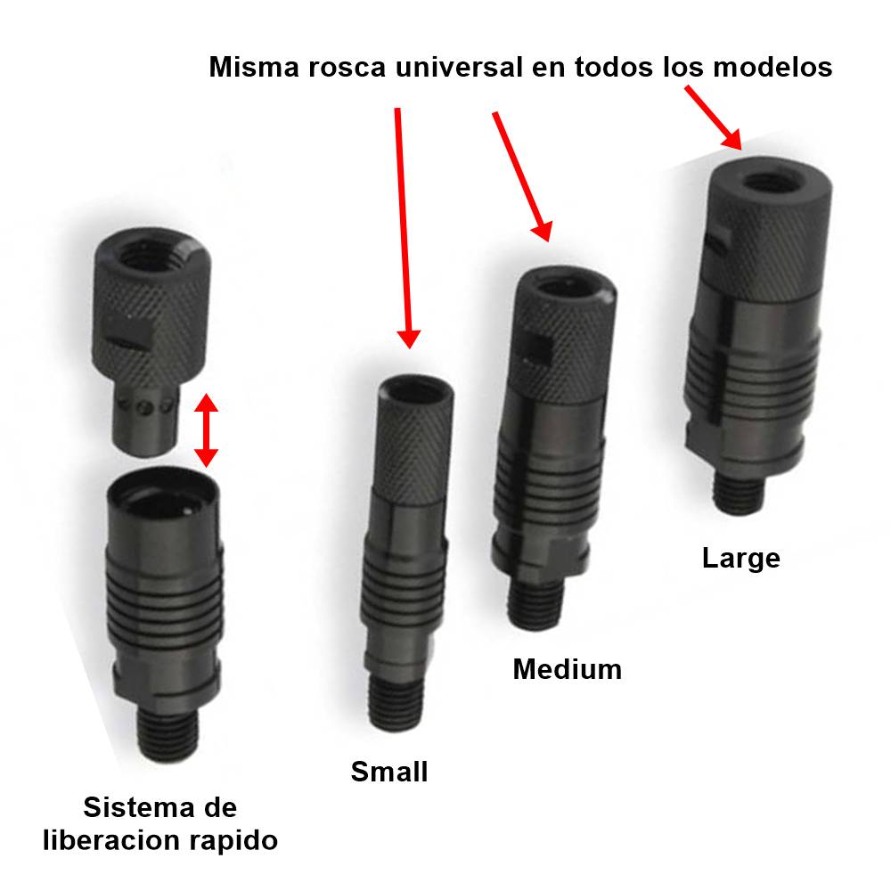 Nueva evolución del conector rapido, un ahorro de tiempo útil, bola sistema de bloqueo del rodamiento, liberacion instantanea, corte de precisión de aluminio, muy robusta y segura para su uso con sacaderas, banksticks, alarmas etc