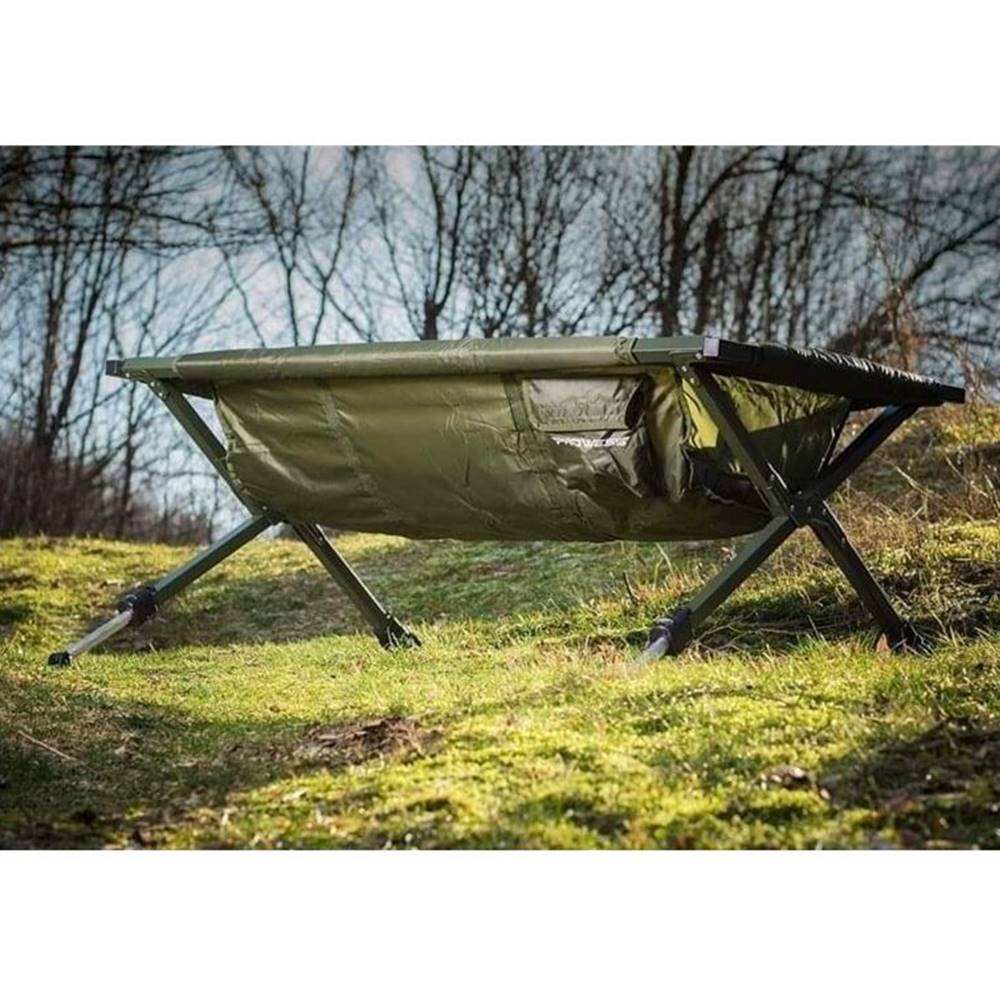 Es un colchón de descanso suspendido, sostenido por una estructura de aluminio. Sus pies ajustables permiten montarlo horizontalmente en cualquier banco. Finalmente, cabe en una bolsa relativamente compacta. La colchoneta de aterrizaje Absolum desarrollada por Prowess tiene un bolsillo para báscula en el lateral y dos desagües laterales para drenar rápidamente el exceso de agua al humedecer la carpa.