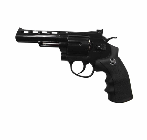 REVOLVER ACCIONADO POR CO2 QUE LE CONFIERE POTENCIA A ESTE ARMA TAN CLÁSICA COMO ROBUSTA, UTILIZA BAINAS CON FORMA DE BALA DONDE SE CARGARAN LOS BALINES DE ACERO QUE UTILIZA.