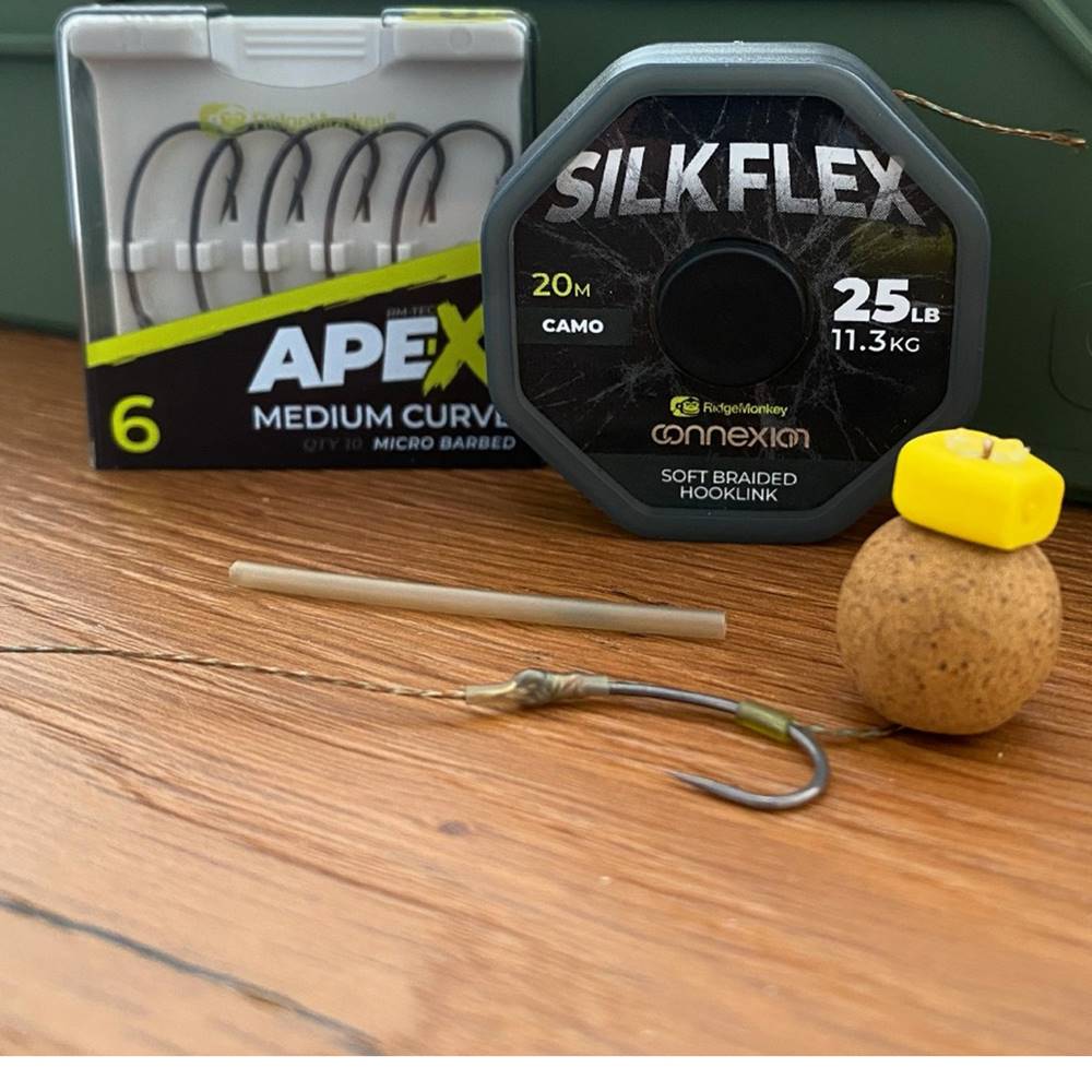 Material de anzuelo trenzado ultra fino. Súper flexible, la trenza blanda SilkFlex es perfecta para usarla en bolsas de PVA sólidas y como alternativa ideal de anzuelo cuando se trata de peces presionados que ya lo han visto todo. Es ideal para utilizarla como sección flexible de un aparejo Combi tradicional, ya que ofrece la máxima flexibilidad. Excelente resistencia a la abrasión y acabado de baja visibilidad. Disponible en Camo en 25lb/11.3kg de tensión de rotura. 20 m por bobina.