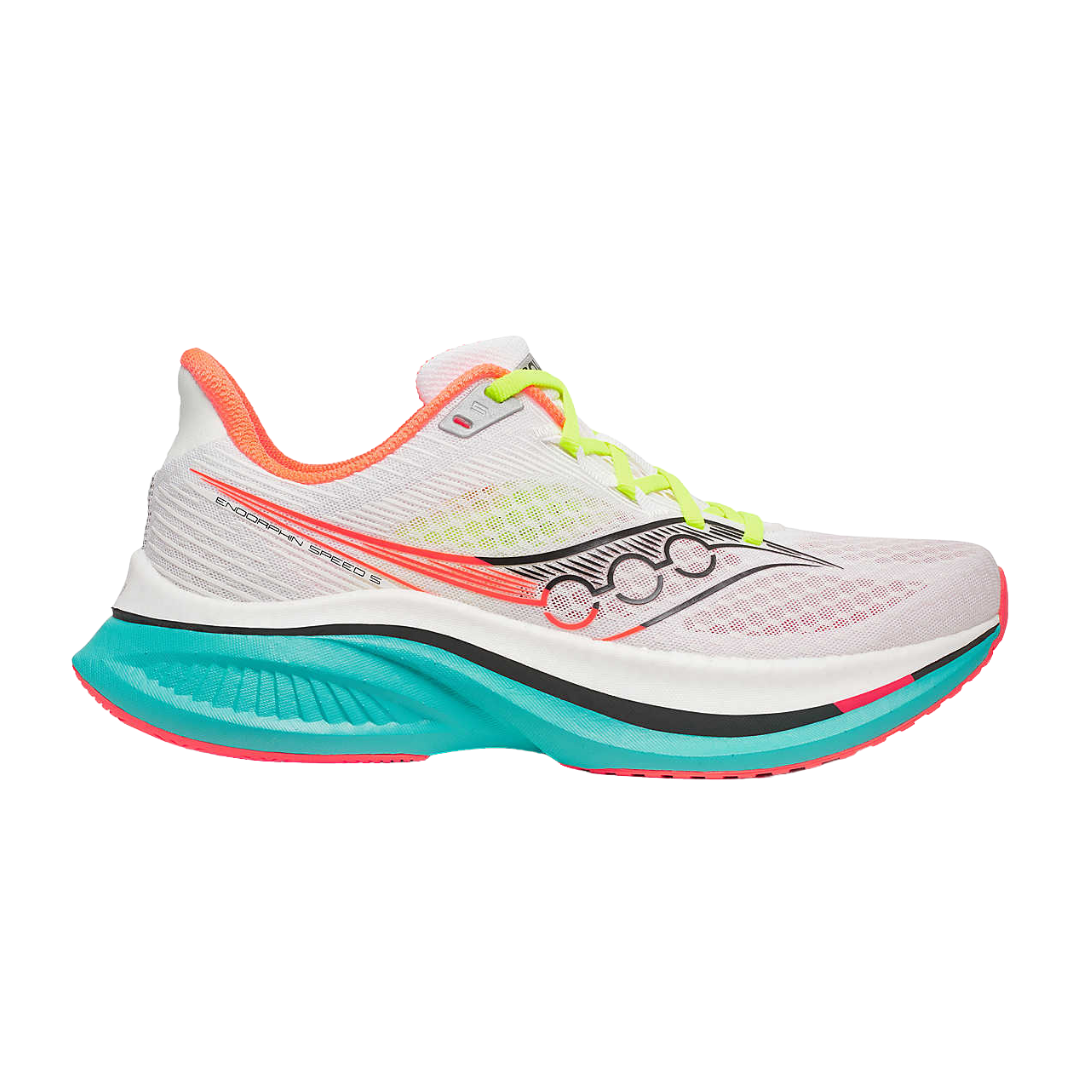 La suela de la Endorphin Speed 5 ha sido optimizada para conseguir transiciones suaves gracias a su geometría tipo rocker (tecnología SPEEDROLL) y a una ranura longitudinal que facilita el ciclo de pisada. Tal y como comentan testers, esta versión ofrece una base más estable, cobertura de goma estratégica que mejora la durabilidad en talón y una tracción adecuada para entrenamientos intensos y competiciones.