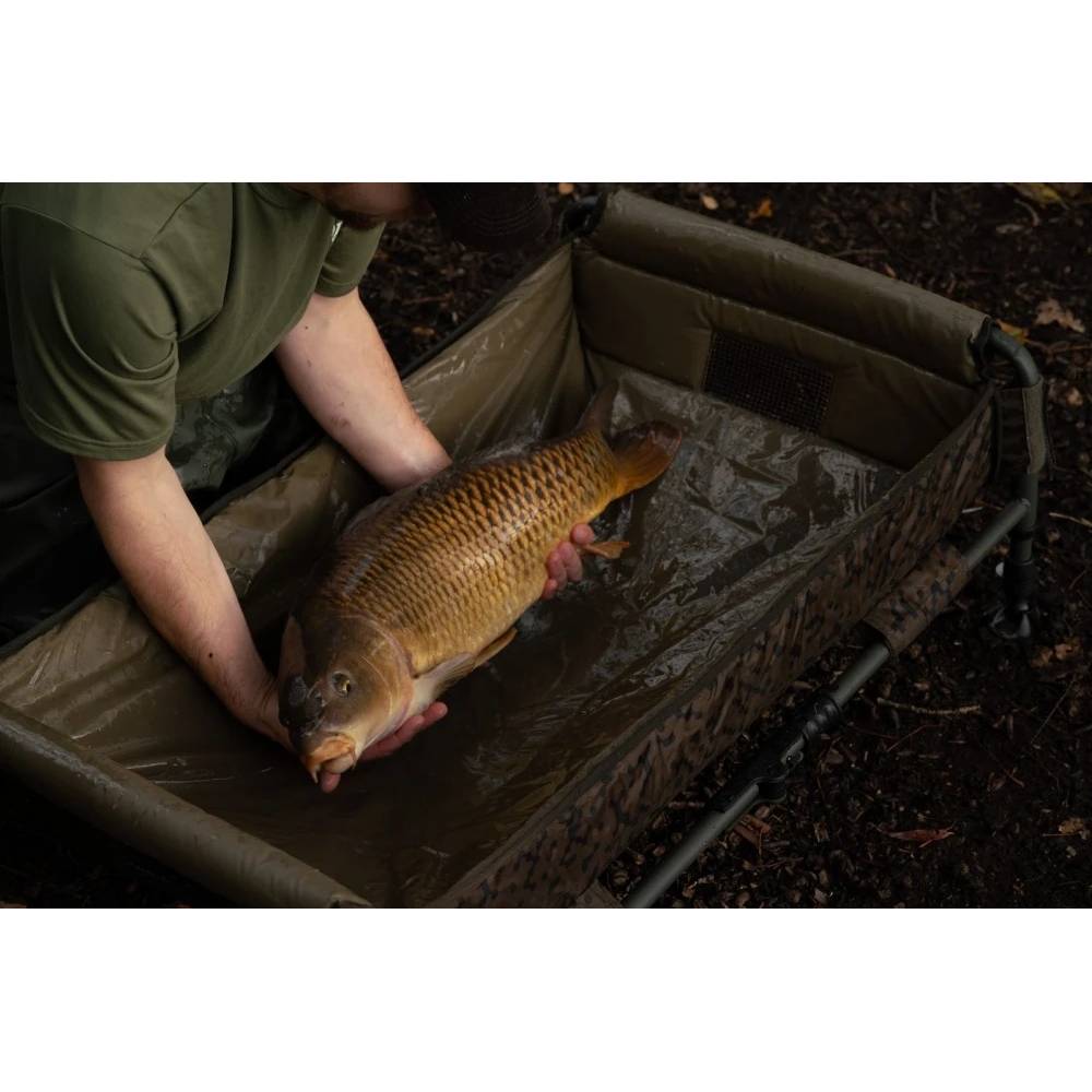 Gracias a sus cuatro patas ajustables, cada una con 50 mm de ajuste, la cuna se mantiene estable en cualquier terreno. La cubierta impermeable y oscurecedora protege al pez de escapar y de las inclemencias del tiempo, mientras que las aberturas de ventilación de malla de goma drenan rápidamente el exceso de agua.