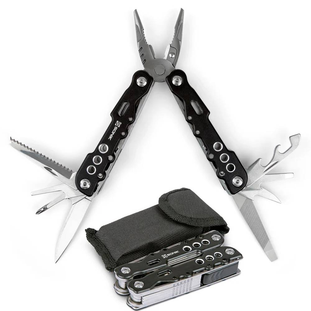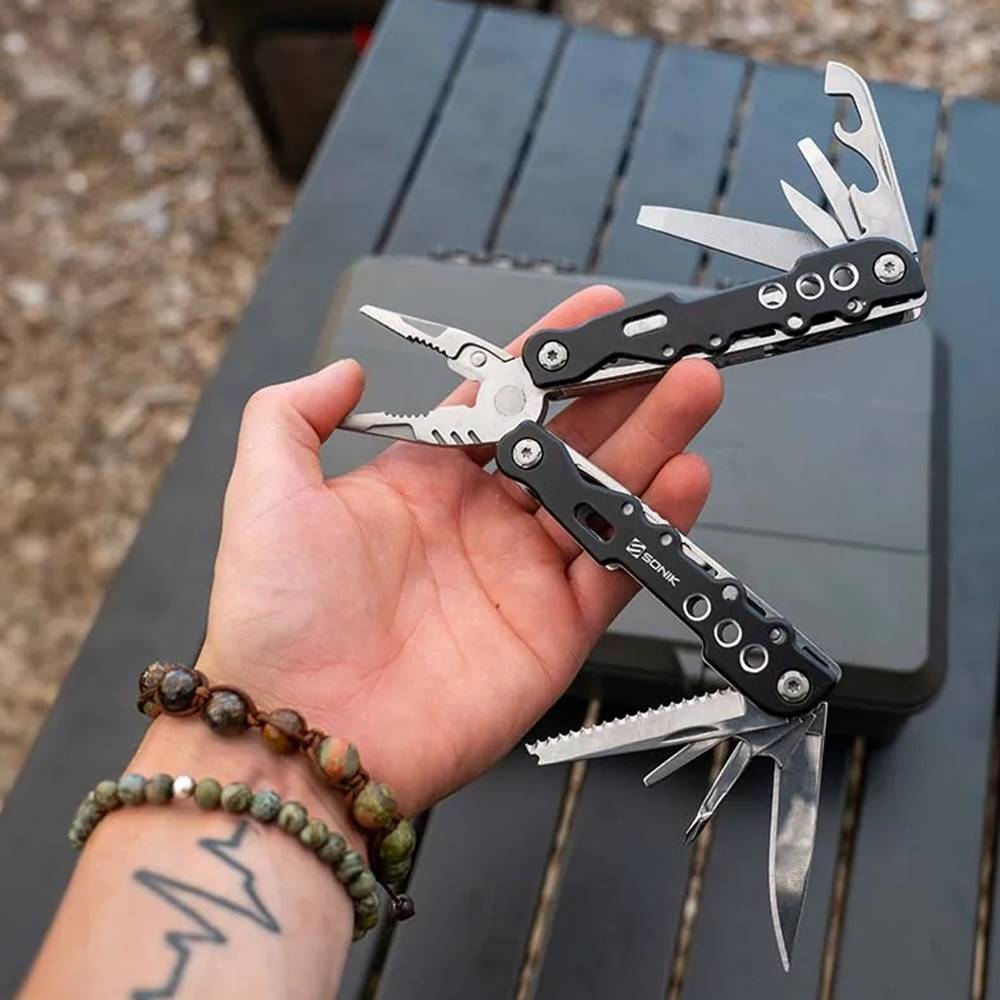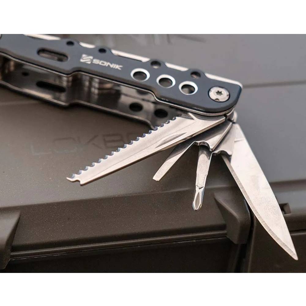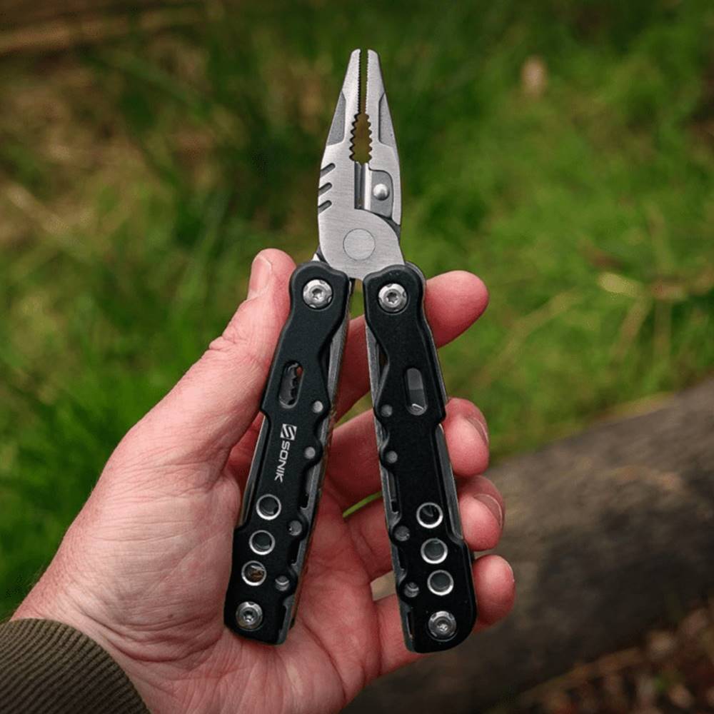 Herramienta multiusos de la marca Sonik, perfecta para incorporarla a cualquier caja de aparejos, ideal para acampada, camper y pesca.