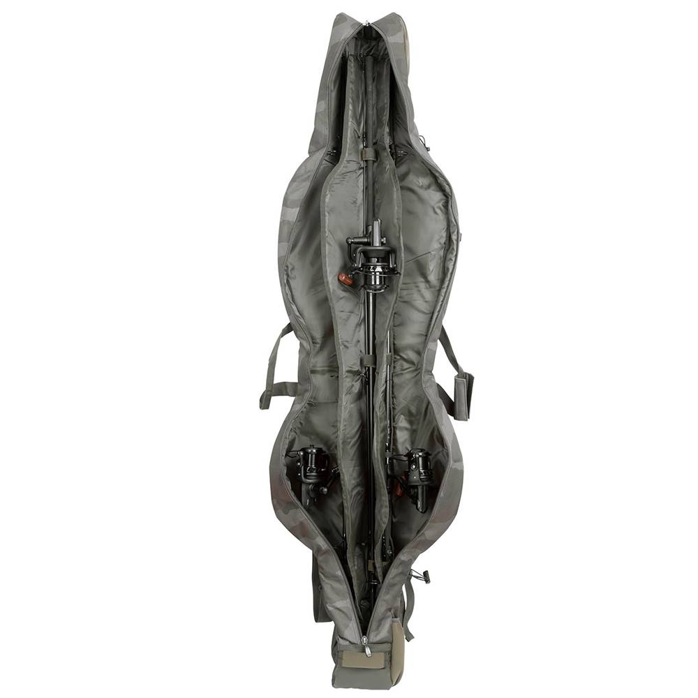 Fundas multiusos compactas  que permiten guardar de forma segura sus cañas, accesorios y refugio. Su diseño interior vertical les confiere un perfil muy fino, pero su tamaño permite alojar fácilmente carretes de gran tamaño y anillas de 50 mm. Los divisores totalmente acolchados y las correas de velcro mantienen sus cañas seguras. El innovador sistema de bolsillos laterales se puede ampliar para alojar un vivac tipo paraguas, una sacadera, una eslinga de plomo, una eslinga de retención y palos de banco. Si lo necesita, puede añadir dos cañas adicionales al exterior de la funda. Otras características incluyen dos asas de carga para coche, una correa de hombro acolchada y dos bolsillos externos para plomos.