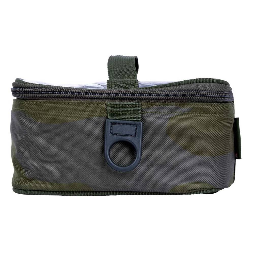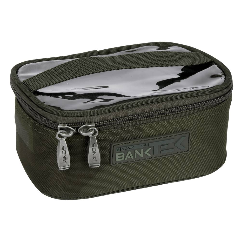 Bolso de lona fuerte semi-rígido para guardar plomos, material de montaje y accesorios de la marca Sonik modelo Bank-Tek en tamaño mediano con diseño camuflaje en color verde, especial para la pesca de carpfishing. Dimensiones 19 x 13 x 8 cm