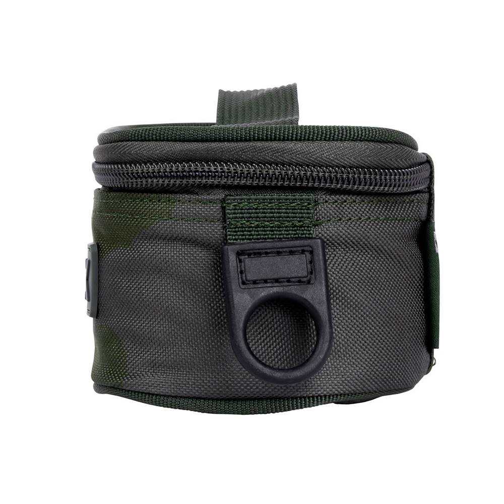 Bolso de lona fuerte semi-rígido para guardar plomos, material de montaje y accesorios de la marca Sonik modelo Bank-Tek en tamaño pequeño con diseño camuflaje en color verde, especial para la pesca de carpfishing.