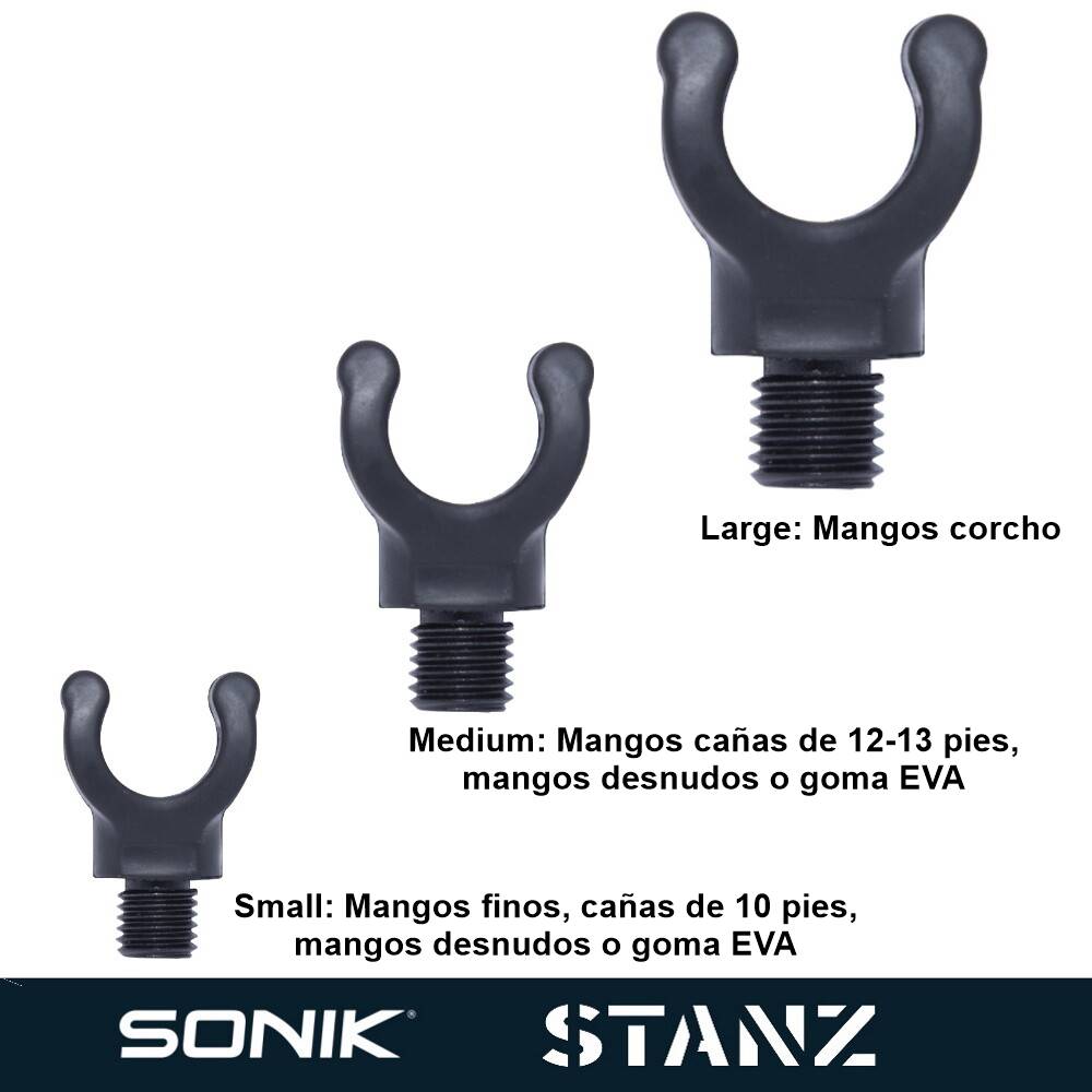 Los apoya cañas de la marca SONIK han sido diseñados para proporcionar la máxima eficiencia. Están disponibles en tres tamaños para adaptarse a la mayoría de las configuraciones de mangos de caña de carpa y diámetros de tope de hoy en día. Construidos con un material de núcleo de nailon resistente con un acabado recubierto de goma, proporcionan la tensión suficiente para asegurar el tope de la caña.