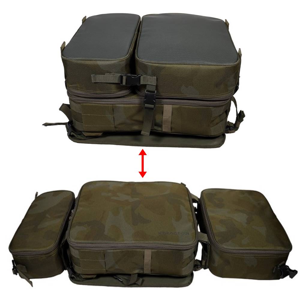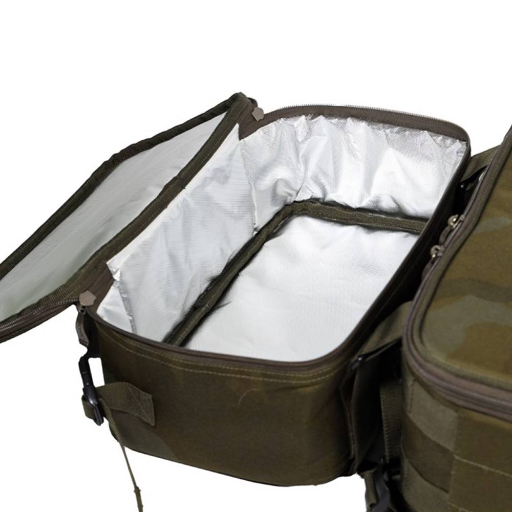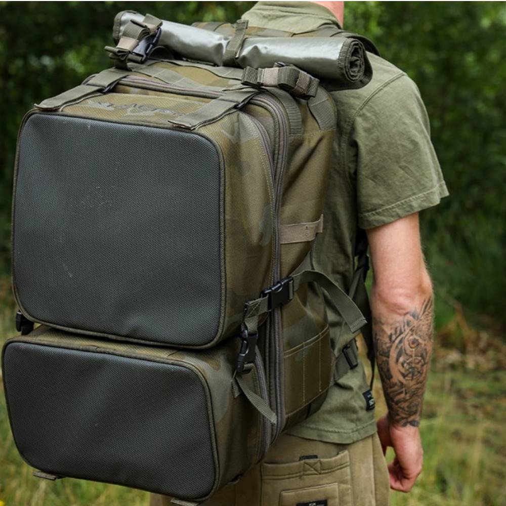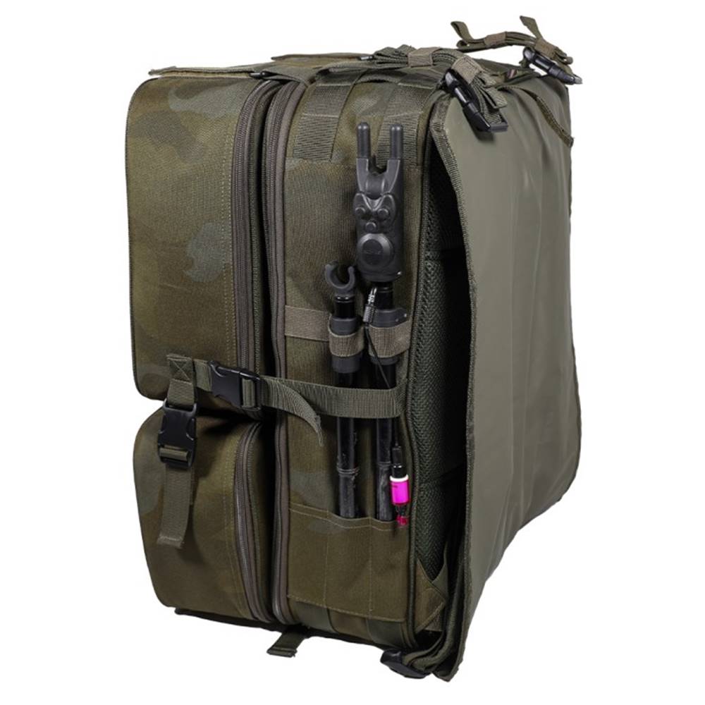Diseñado para el pescador móvil con acceso rápido al aparejo > Bolsillos modulares de tamaño adecuado para la mayoría de las bolsas de accesorios > Material de camuflaje Bank-Tek con respaldo de PVC HD 600D > Base impermeable HD > Arnés acolchado con correa para el esternón.