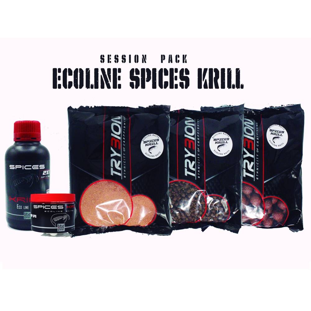 Lote de cebos de la marca Trybion gama Ecoline sabor Spices Krill. Cebos fabricados con ingredientes de máxima calidad, de textura increíble y gran rendimiento en mantenimiento de cebaderos. Pack perfecto para fabricar tus mallas y bolsas de PVA, especial para la pesca de carpfishing.