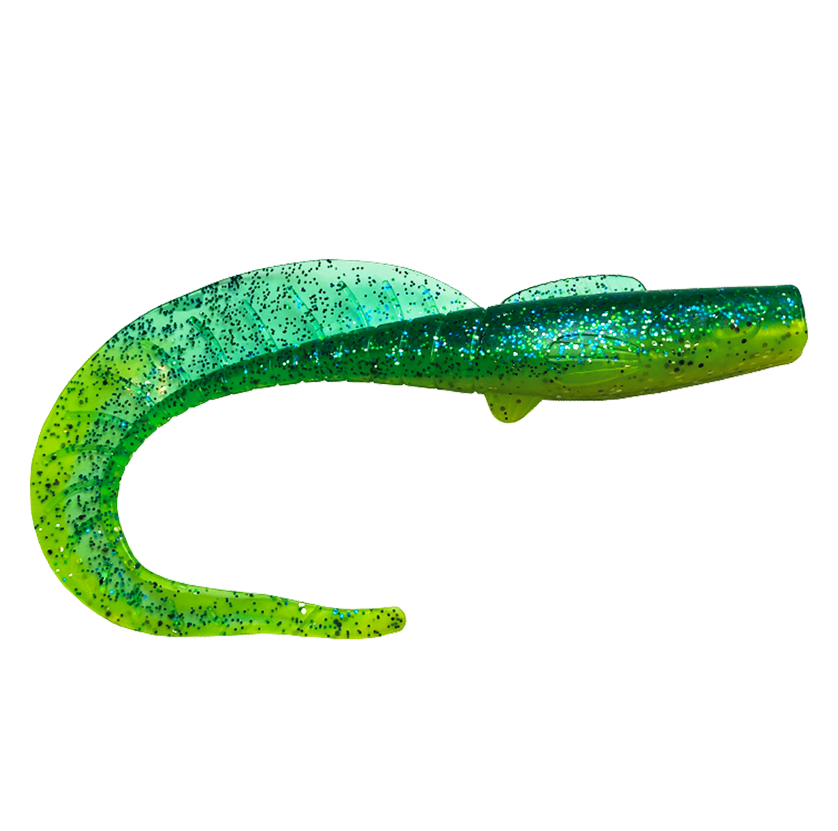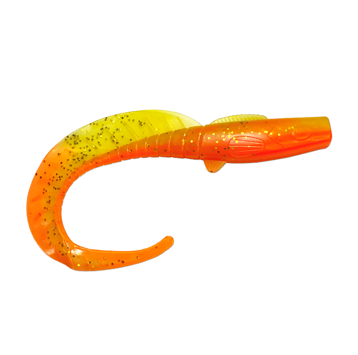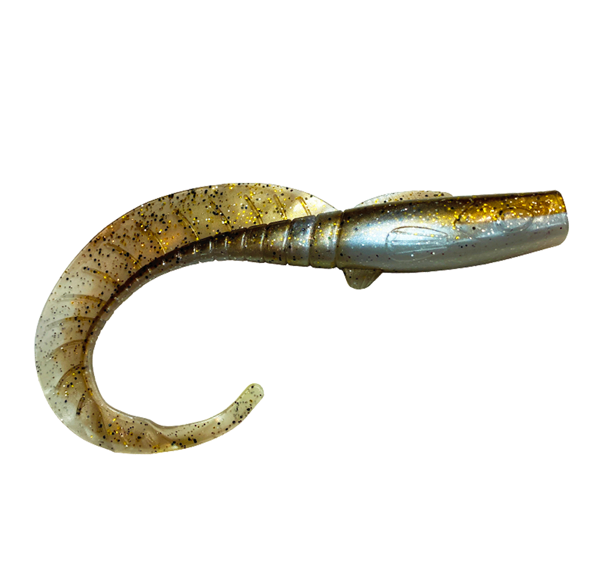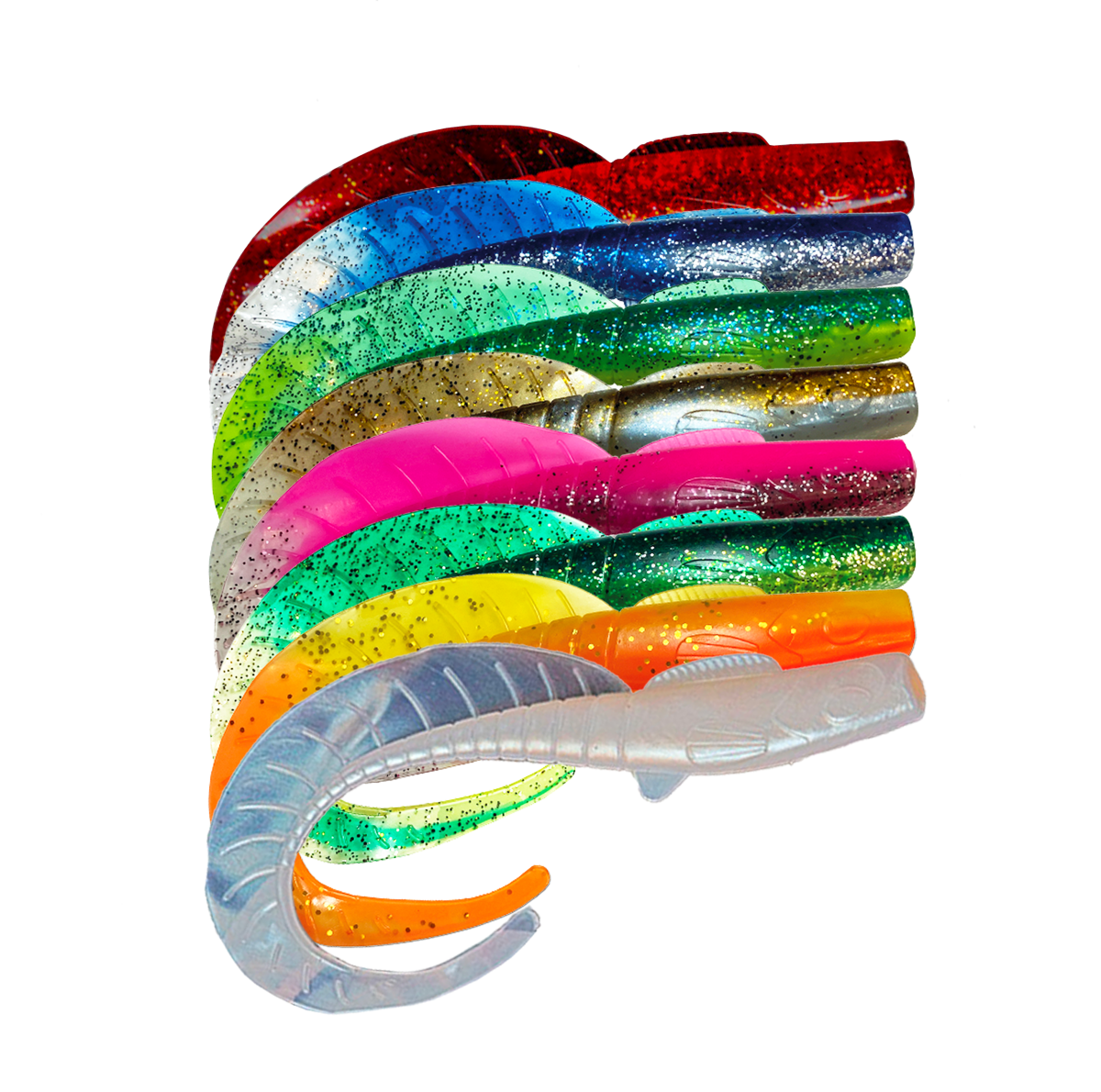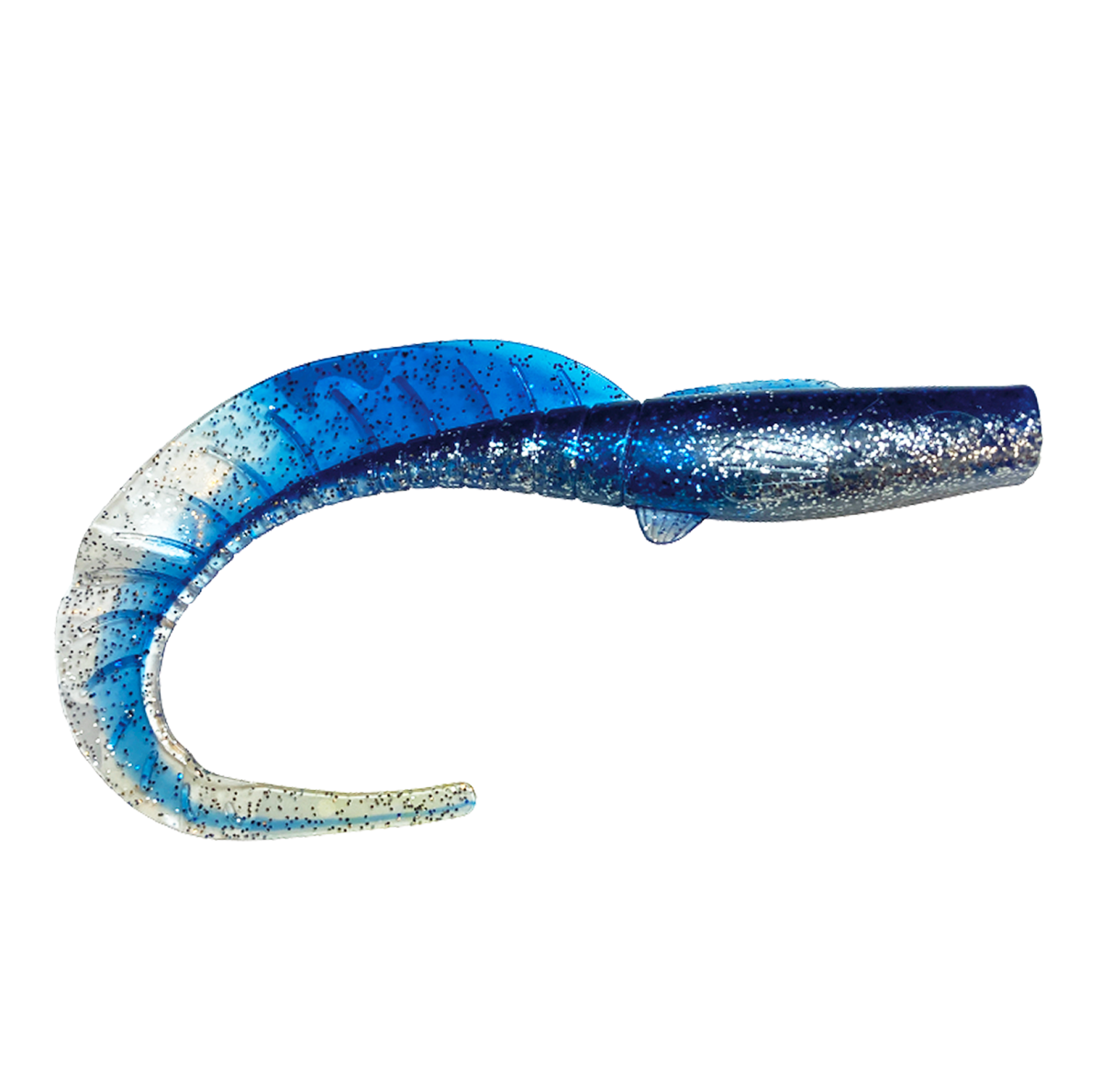Señuelo blando de 16 cm compuesto por 5 cm de cuerpo sólido y 10 cm de cola tipo «pig tail» o «cola de chancho», la cual genera un movimiento sinuoso atractivo para diferentes especies predadoras. Puede trabajar con «jig head» entre 20 y 60 gramos según la profundidad de la zona de pesca o la distancia de lance lance que uno necesite alcanzar. Es sumamente efectivo para la pesca de cabrillas, corvinas, lenguados y hasta tramboyos de gran tamaño.