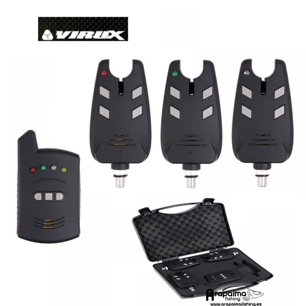 Fantastico Maletín de tres alarmas de picada inalámbricas y central de recepción. Con gran distancia de recepcion, resistentes a las inclemencias del tiempo, con toda la garantia de la marca española Virux del grupo EVIA. Botón ON/OFF. Control de volumen Control del tono tanto en central como en avisador (6 niveles). Control de sensibilidad (6 niveles). Modo vibración. Pila de 9V para avisador y central. Servidas en un practico maletin rigido.