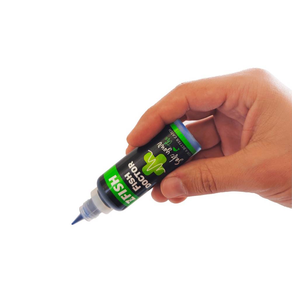 Está específicamente formulado para adherirse al tejido y permanecer en su lugar durante un tiempo considerable. En una prueba de acuario, el gel fue evidente 72 horas después de la aplicación. Fácil de aplicar, se puede usar solo o, para obtener los mejores resultados, en combinación con la solución Fish Doctor.